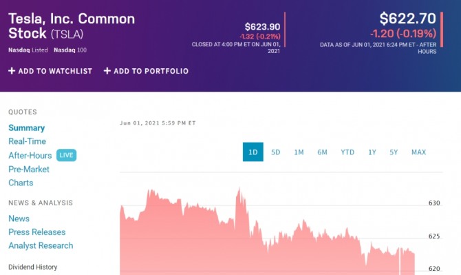 이미지 확대보기2일 뉴욕증시와 한국예탁결제원에 따르면 5월중 국내 서학 개미투자자들의 테슬라 순매수 금액은 8천80만달러로 2020년 5월 이후 처음으로 1억 달러를 밑돌았다. 테슬라의 주가가 고점을 찍은 1월과 비교하면 10분의 1도 안 된다. 7개월 연속 지켜온 해외주식 순매수 1위 자리도 아마존에 내줬다.