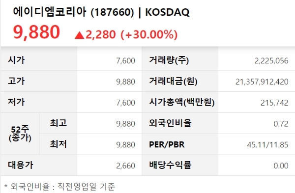 이미지 확대보기3일 한국거래소에 따르면 에이디엠코리아 주가는 오전 9시 20분 현재 시초가 대비 30.00% 오른 9880원에 거래되고 있다.