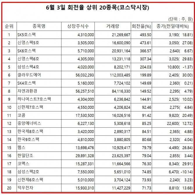 3일 주식시장에서 코스닥 종목의 거래량 회전율 기준 상위 종목은 다음과 같다.
