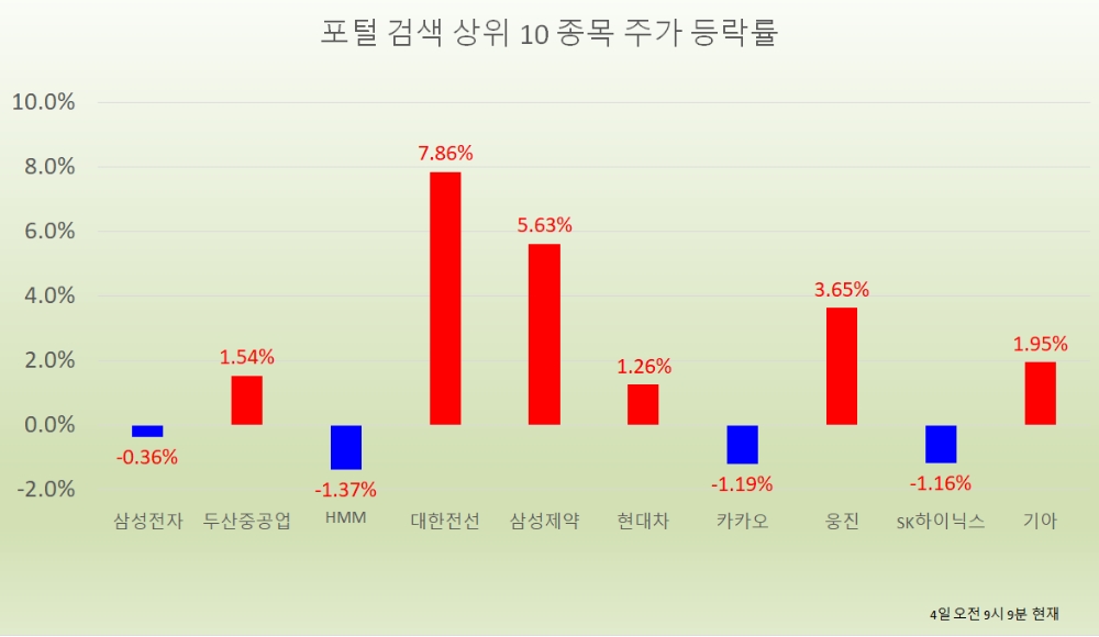 오전 9시 9분 현재 포털사가 집계하는 검색량 기준 상위 20개 종목의 현황은 다음과 같다.