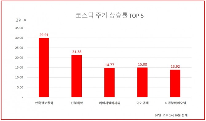 1위 한국정보공학 5560원 ( 29.91% ), 2위 신일제약 16750원 ( 21.38% ), 3위 에이치엘비파워 2875원 ( 14.77% ), 4위 아이엠텍 690원 ( 15% ), 5위 티앤알바이오팹 37650원 ( 13.92% ), 6위 디지탈옵틱 6980원 ( 13.68% ), 7위#현대바이오 37600원 ( 11.9% ), 8위 지티지웰니스 4760원 ( 12.53% ), 9위 젬백스링크 2060원 ( 12.26% ), 10위 휴먼엔 9920원 ( 11.59% )
