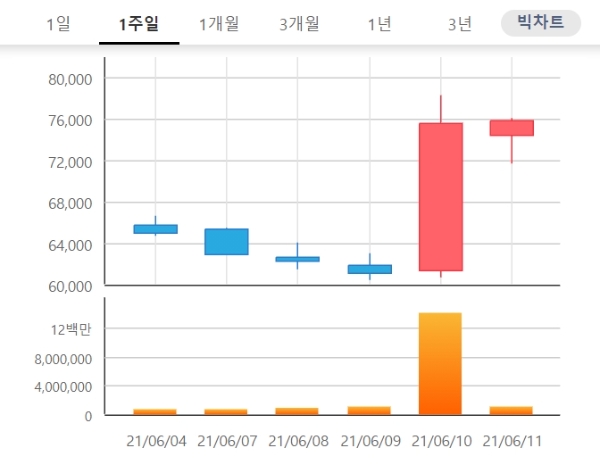 신풍제약 주가는 종가기준으로 2일 6만5500원에서 10일 7만5600원으로 약 15% 뛰었다.