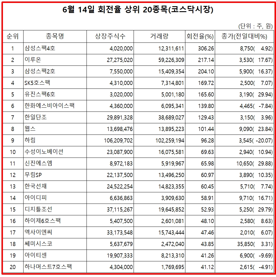 표기순서는 거래량 회전율 순위, 종목명, 거래량 회전율, 14일 종가, 주가 등락율 순이다.