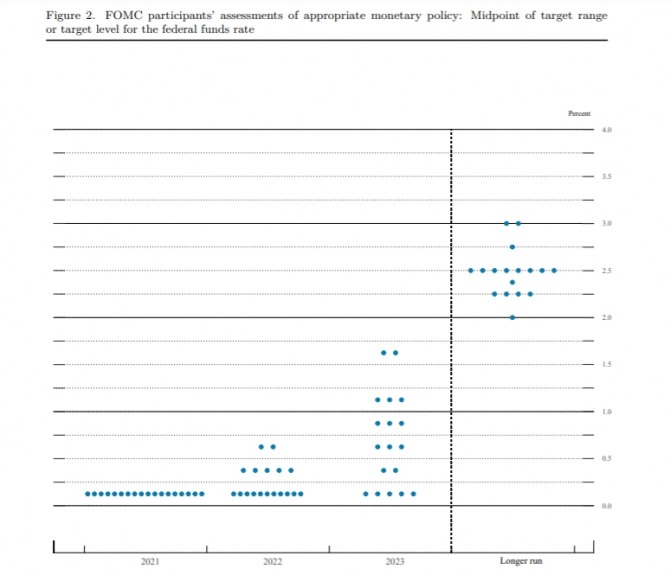 FOMC 위원 18명 가운데 13명이 2023년 연준이 금리를 인상할 것으로 예상했다. 그 중 대다수인 11명이 두 차례 금리 인상을 점쳤다. 위원 7명은 2022년에 금리가 인상될 수 있다는 견해를 보였다. 오는 2023년 말까지 현행의 제로 금리가 유지될 것이라는 전망을 제시한 위원은 5명이다. 이런 전망은 지난 3월 FOMC 회의 때보다 ZMRP 앞당겨진 것DLEK. 당시에는 4명이 2022년에, 그리고 7명이 2023년에 금리가 인상될 가능성이 있다는 입장이었다.