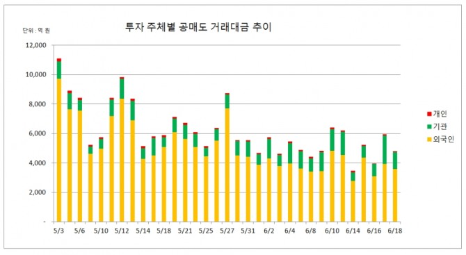 외국인 투자자들은 공매도 재개 시점인 지난달 3일 부터 이달 18일 까지 총 16조7713억 원의 공매도 거래대금을 기록했다.