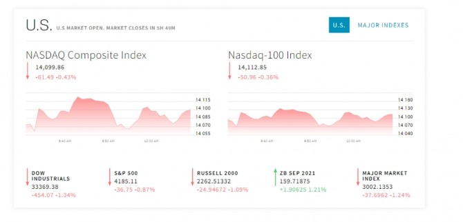 앞서 뉴욕증시는 연방공개시장위원회(FOMC) 정례회의 결과를 소화하며 지수별로 엇갈린 모습이다. 뉴욕증권거래소(NYSE)에서 다우존스30산업평균지수는 210.22포인트(0.62%) 하락한 33,823.45로 마쳤다. 스탠더드앤드푸어스(S&P)500지수는 1.84포인트(0.04%) 떨어진 4,221.86을 기록했다. 기술주의 나스닥지수는 121.67포인트(0.87%) 오른 14,161.35로 마감했다. 미국 시카고상품거래소(CME) 페드워치에 따르면 연방기금(FF) 금리선물 시장은 올해 12월 25bp 기준금리 인상 가능성을 2.1%로 보았다, 옵션거래소(CBOE)에서 변동성지수(VIX)는 0.40포인트(2.20%) 하락한 17.75를 기록했다.