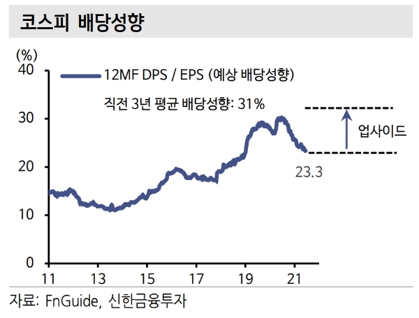 김상호 신한금융투자 연구원은 "코스피 5년 평균 배당성향이 31.0%인 점을 감안하면 코스피 배당금의 업사이드는 33% 수준이다”며 “현재 2021년 코스피 배당수익률 시장기대치는 1.6%지만 평균 배당성향 반영하면 2.3%까지 개선 여력이 남았다”고 분석했다.