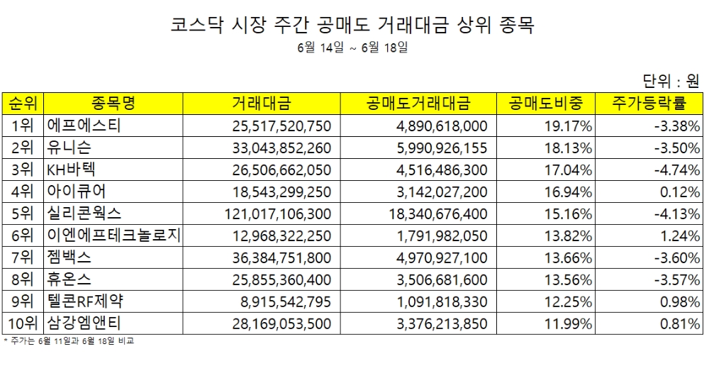 유니슨 주식이 공매도 거래비중 18.13%를 기록해 코스닥 시장에서 공매도 거래대금 비중 2위를 기록했다.
