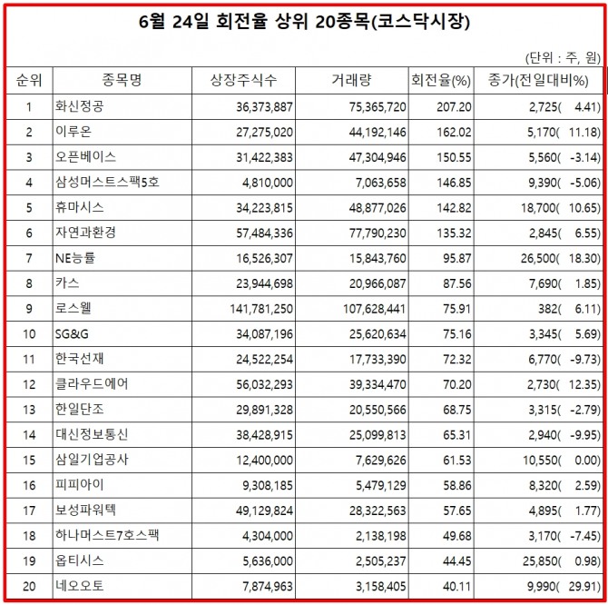 표기순서는 거래량 회전율 순위, 종목명, 거래량 회전율, 24일 종가, 주가 등락율 순이다.
