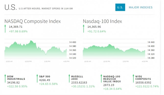 뉴욕증시는 조 바이든 미국 대통령과 상원 의원들이 사회기반시설(인프라) 지출안에 합의했다는 소식 등으로 올랐다. 25일 뉴욕증권거래소(NYSE)에 따르면 다우존스30산업평균지수는 322.58포인트(0.95%) 오른 34,196.82로 마쳤다. 스탠더드앤드푸어스(S&P)500지수는 전장보다 24.65포인트(0.58%) 뛴 4,266.49에 기술주의 나스닥지수는 전장보다 97.98포인트(0.69%) 상승한 14,369.71로 장을 마쳤다. S&P500지수와 나스닥 지수는 또 사상 최고치를 경신했다.