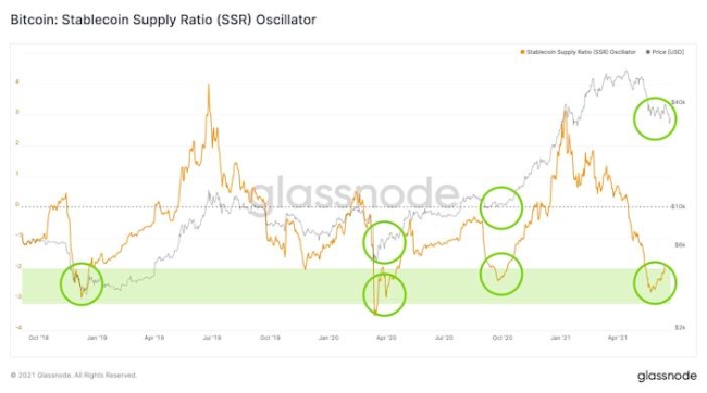 스테이블 코인 공급 비율 오실레이터는 거래자들이 SSR에 대한 극단적인 수치와 임박한 추세 변화를 파악하는 데 도움이 된다. 하지만 이 지표는 피아트 기반 거래(fiat-based trades)나 비트코인 파생상품을 고려하지 않으며, 완벽한 지표는 아니다. 그런데도 그것은 과거에 믿을 수 있는 변화의 지표였음이 입증됐다.