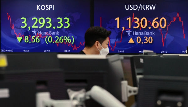 29일 코스피가 장중 3280선으로 내리고 있다.