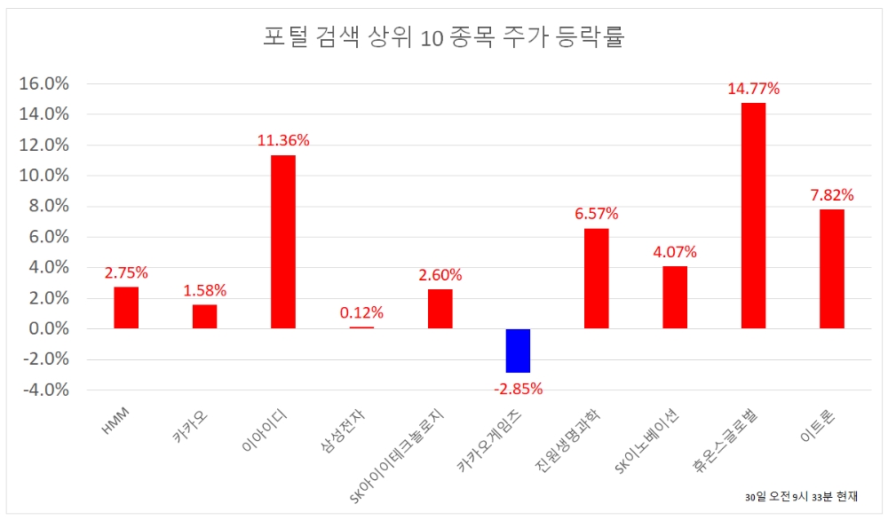 오전 9시 35분 현재 포털사가 집계하는 검색량 기준 상위 20개 종목의 현황은 다음과 같다.