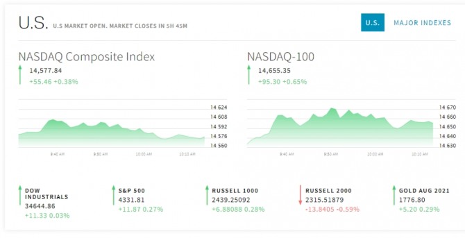 앞서 뉴욕증시는 주간 실업 지표 등이 개선됐다는 소식에 상승했다. 뉴욕증권거래소(NYSE)에서 다우존스30산업평균지수는 131.02포인트(0.38%) 오른 34,633.53으로 마감했다. 스탠더드앤드푸어스(S&P)500지수는 22.44포인트(0.52%) 상승한 4,319.94를, 그리고 기술주의 나스닥지수는 전장보다 18.42포인트(0.13%) 뛴 14,522.38로 거래를 마쳤다. S&P500지수는 올해 들어 35번째 사상 최고치를 경신했다.