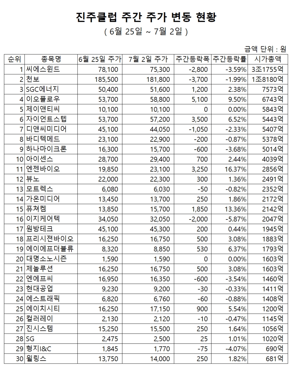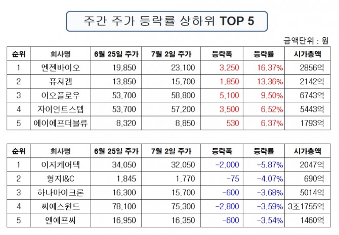 표기순서는 순위, 종목명, 주가, 주간 등락폭, 주간 등락률 순이다.