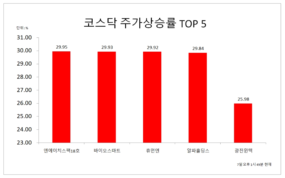 7일 오후 1시 49분 현재 코스닥 상승률 상위 50개 종목은 다음과 같다.