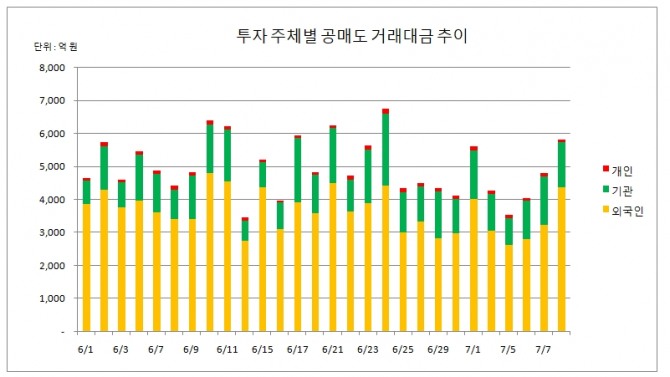 외국인 투자자들은 공매도 재개 시점인 지난 5월 3일 부터 이달 8일 까지 총 21조6520억 원의 공매도 거래대금을 기록했다.