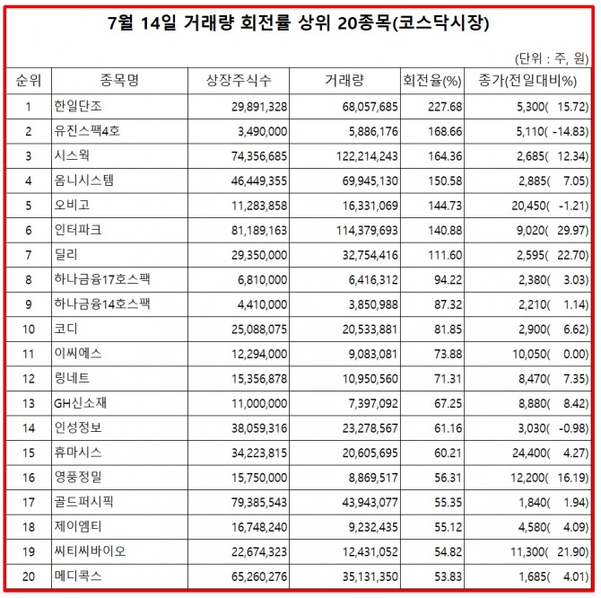 14일 주식시장에서 코스닥 종목의 거래량 회전율 기준 상위 종목은 다음과 같다.