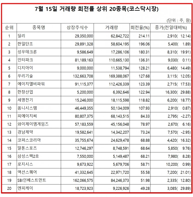 15일 주식시장에서 코스닥 종목의 거래량 회전율 기준 상위 종목은 다음과 같다.