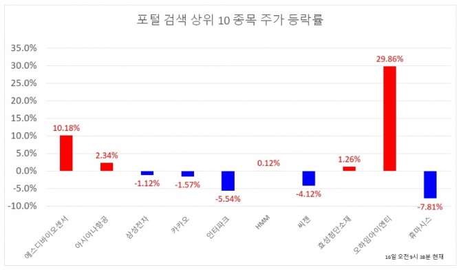 표기 순서는 포털사 기준 검색 상위 랭킹, 종목명, 현재가, 주가 등락률 순이다.
