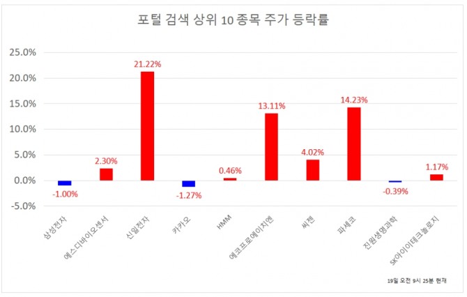 표기 순서는 포털사 기준 검색 상위 랭킹, 종목명, 현재가, 주가 등락률 순이다.
