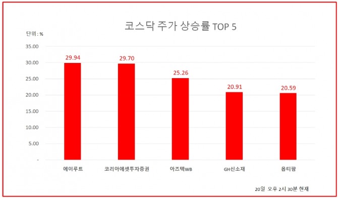 20일 오후 2시 30분 현재 코스닥 상승률 상위 50개 종목은 다음과 같다.