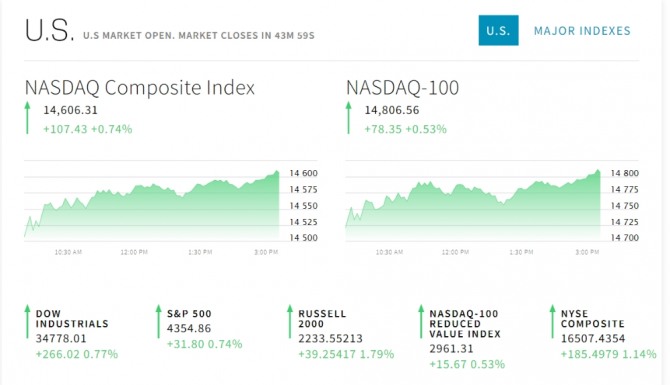 이미지 확대보기22일 뉴욕증시에 따르면 뉴욕증권거래소(NYSE)에서 다우존스30산업평균지수와 스탠더드앤드푸어스(S&P)500지수 그리고 기술주의 나스닥지수 모두 오르고 있다. 코로나19 델타 변이 확산 우려에 따른 경기 둔화 가능성에 크게 하락했던 뉴욕증시는 그 이전의 낙폭을 모두 회복했다. 폭락의 공포 심리가 다소 안정을 찾은가운데 분기 실적에 주목하는 모습이다. 코카콜라와 버라이즌이 예상치를 웃도는 매출과 순이익을 발표했다. 존슨앤드존슨의 분기 매출과 순이익도 예상치를 웃돌았다. 멕시칸 패스트푸드점 치폴레는 주가가 폭발하고 있다. 넷플릭스는 급락했다. 미국의 주택담보대출 즉 모기지 금리는 반등했다. 10년물 국채금리도 오름세다. 10년물 금리는 1.3%을 앞두고 있다.