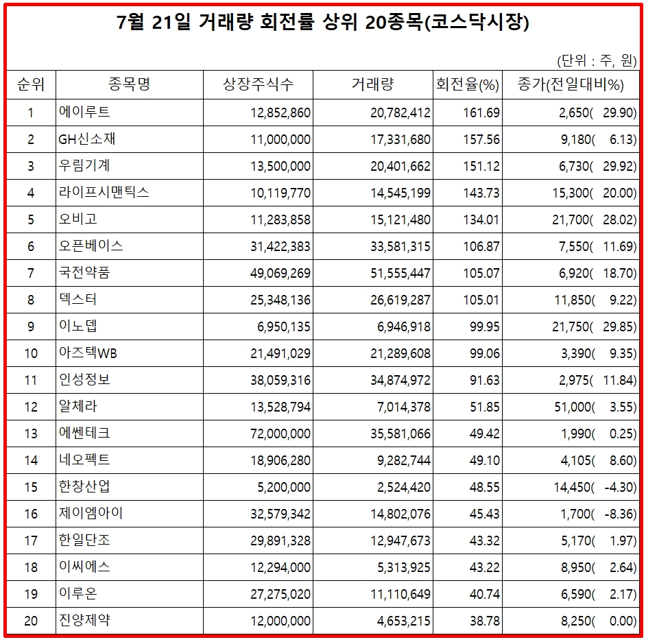 표기순서는 거래량 회전율 순위, 종목명, 거래량 회전율, 21일 종가, 주가 등락율 순이다.