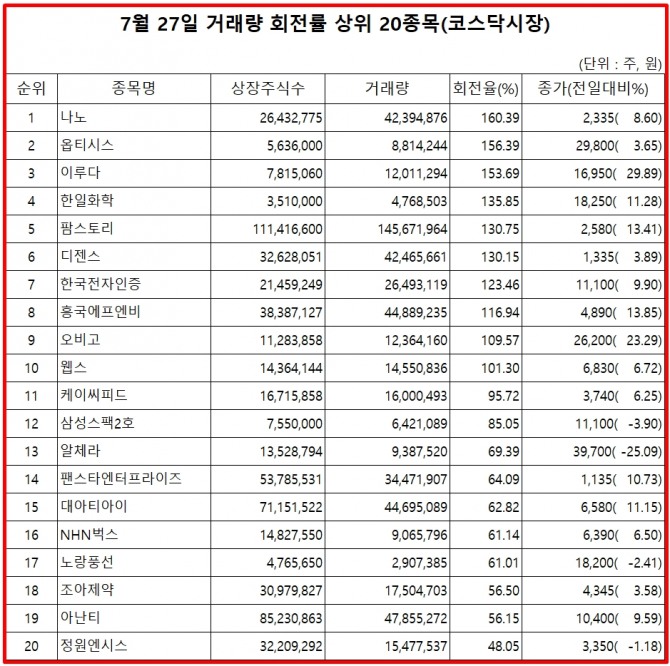 표기순서는 거래량 회전율 순위, 종목명, 거래량 회전율, 27일 종가, 주가 등락율 순이다.