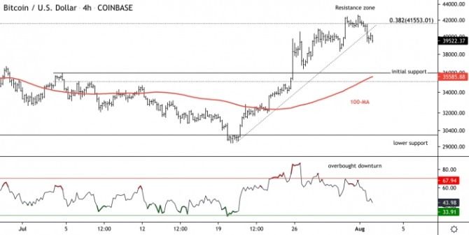 4시간 차트의 상대 강도지수(RSI)는 일련의 낮은 고점을 기록했으며 이는 단기 상승 추세가 약화되고 있음을 시사한다. RSI는 아직 과매도 상태가 아니며, 약 3만4,000달러의 초기 지원을 위해 추가 이익을 얻을 수 있을 것으로 여겨진다.