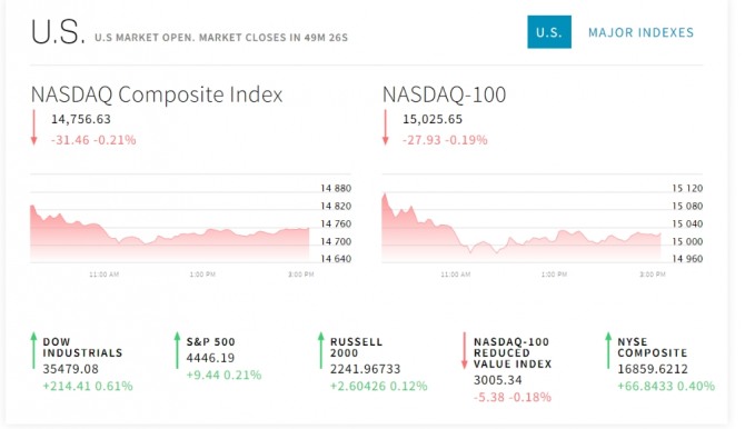 이미지 확대보기12일 뉴욕증시에 따르면 다우존스30산업평균지수는 오르고 있다. 스탠더드앤드푸어스(S&P)500지수도 상승 기조이다.그러나 기술주의 나스닥지수는 상승 개장 후 CPI물가지수 발표 후 하락 반전했다. 연일 사상 최고치를 경신하고 있는 다우지수와 S&P500지수는 고점을 더욱 높였다.