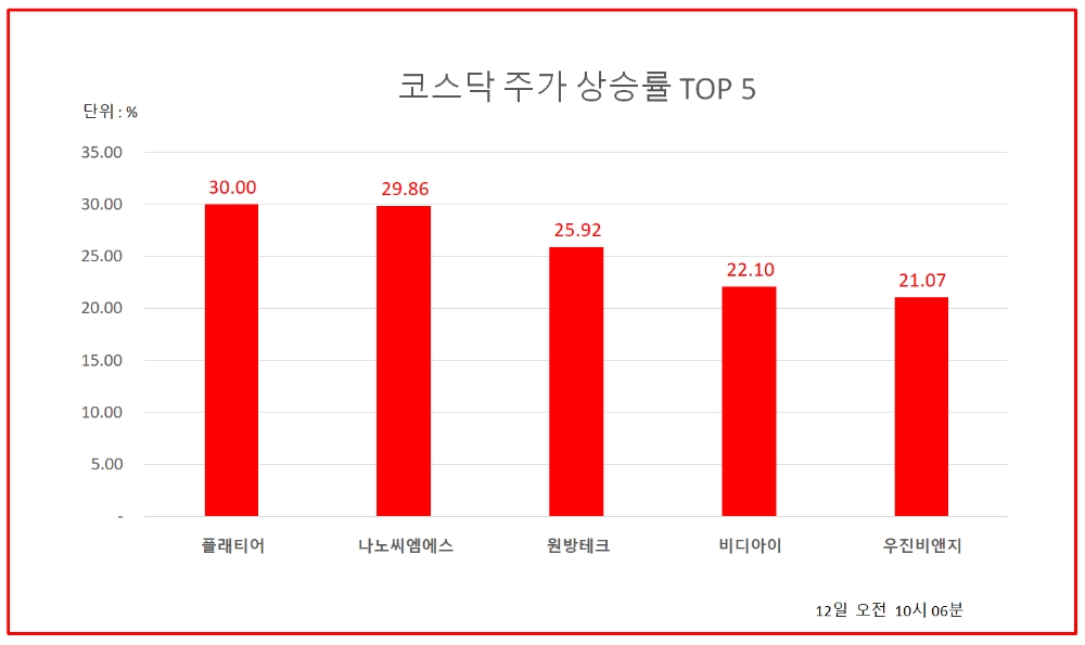 1위 플래티어 28600원 ( 30% ), 2위 나노씨엠에스 57400원 ( 29.86% ), 3위 원방테크 54900원 ( 25.92% ), 4위 비디아이 3950원 ( 22.1% ), 5위 우진비앤지 3275원 ( 21.07% ), 6위 삼일 4210원 ( 20.29% ), 7위 애니젠 20750원 ( 19.25% ), 8위 에코프로에이치엔 166400원 ( 18.27% ), 9위 팍스넷 950원 ( 15.85% ), 10위 경남스틸 4870원 ( 15.27% )
