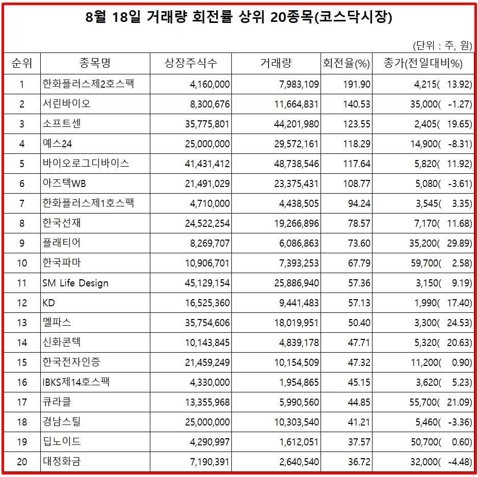 18일 주식시장에서 코스닥 종목의 거래량 회전율 기준 상위 종목은 다음과 같다.