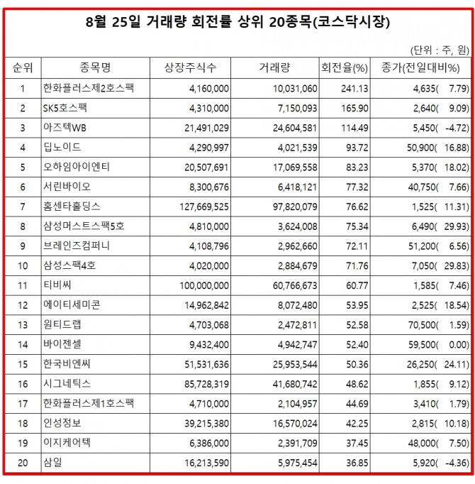 25일 주식시장에서 코스닥 종목의 거래량 회전율 기준 상위 종목은 다음과 같다.