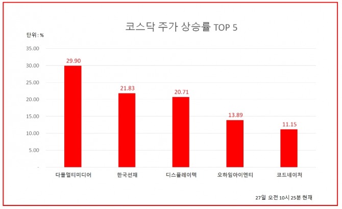 27일 오전 10시 25분 현재 코스닥 상승률 상위 50개 종목은 다음과 같다.