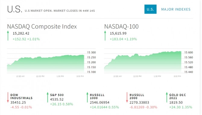 이미지 확대보기31일 뉴욕증권거래소(NYSE)에 따르면 다우존스30산업평균지수는 부진하다. 스탠더드앤드푸어스(S&P)500지수와 기술주의 나스닥지수는 오르고 있다. 연일 사상 최고치로 치솟고 있는 S&P500지수와 나스닥지수는 이날도 고점을 높였다. 반면 다우지수는 하락했다. 제롬 파월 의장이 연내 테이퍼링 가능성을 언급하면서도 기준 금리 인상이 멀었다는 점을 강조하면서 나스닥지수가 상승탄력을 받았다.