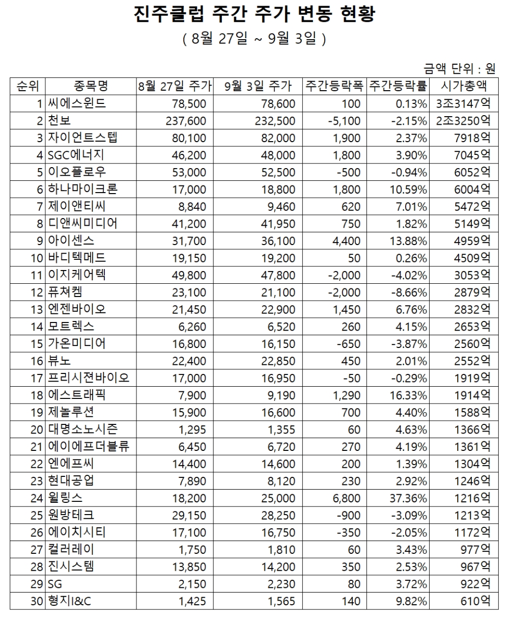 이미지 확대보기'진주클럽'의 주간 기준 주가 상승률 상위 종목은 다음과 같다.