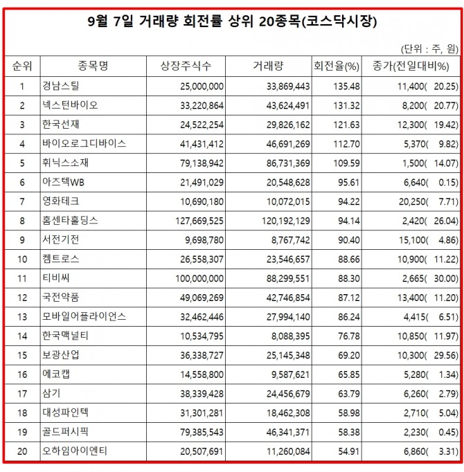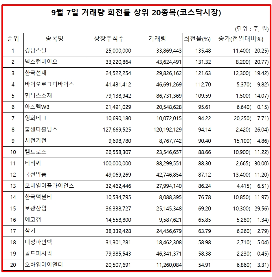 표기순서는 거래량 회전율 순위, 종목명, 거래량 회전율, 7일 종가, 주가 등락율 순이다.