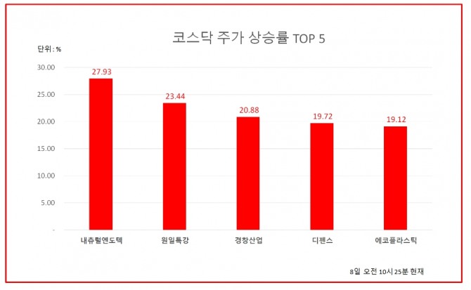 8일 오전 10시 25분 현재 코스닥 상승률 상위 50개 종목은 다음과 같다.