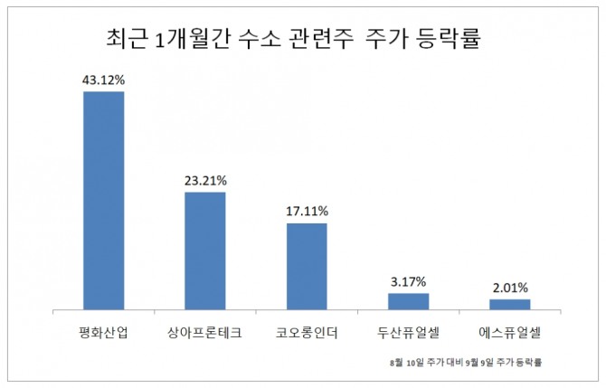 9일 한국거래소에 따르면 수소관련 가스킷(틈막이)을 생산하는 평화산업은 지난달 10일 부터 이달 9일 까지 한달간 43% 급등했다.