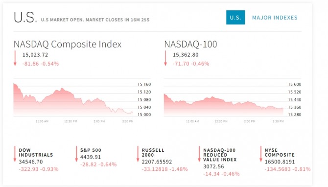 이미지 확대보기15일 뉴욕증시 떼 따르면 8월 소비자물가지수(CPI)가 둔화 발표이후 잠시 오르던 나스닥 다우지수가 다시 하락 반전했다. 뉴욕증권거래소(NYSE)에서 다우존스30산업평균지수와 스탠더드앤드푸어스(S&P)500지수 그리고 나스닥지수는 상승후 하락세를 보이고 있다. .