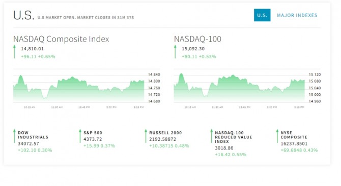 이미지 확대보기22일 뉴욕 증권거래소(NYSE)에 따르면 다우존스30산업평균지수와 스탠더드앤드푸어스(S&P)500지수 그리고 는 전장보다 34.85포인트(0.80%) 상승한 4,392.58을, 기술주 중심의 나스닥지수 도두 상승세다. <나스닥 다우지수 시세표 별첨> 헝다 그룹 사태의 진원지 홍콩증시에서도 항셍지수가 반등했다. 앞서 20일 항셍지수는 헝다 그룹이 오는 23일 도래하는 채권 이자를 내지 못할 수 있다는 우려에 3% 이상 하락했다. 그 충격으로 여파로 뉴욕 증시도 크게 밀렸다.