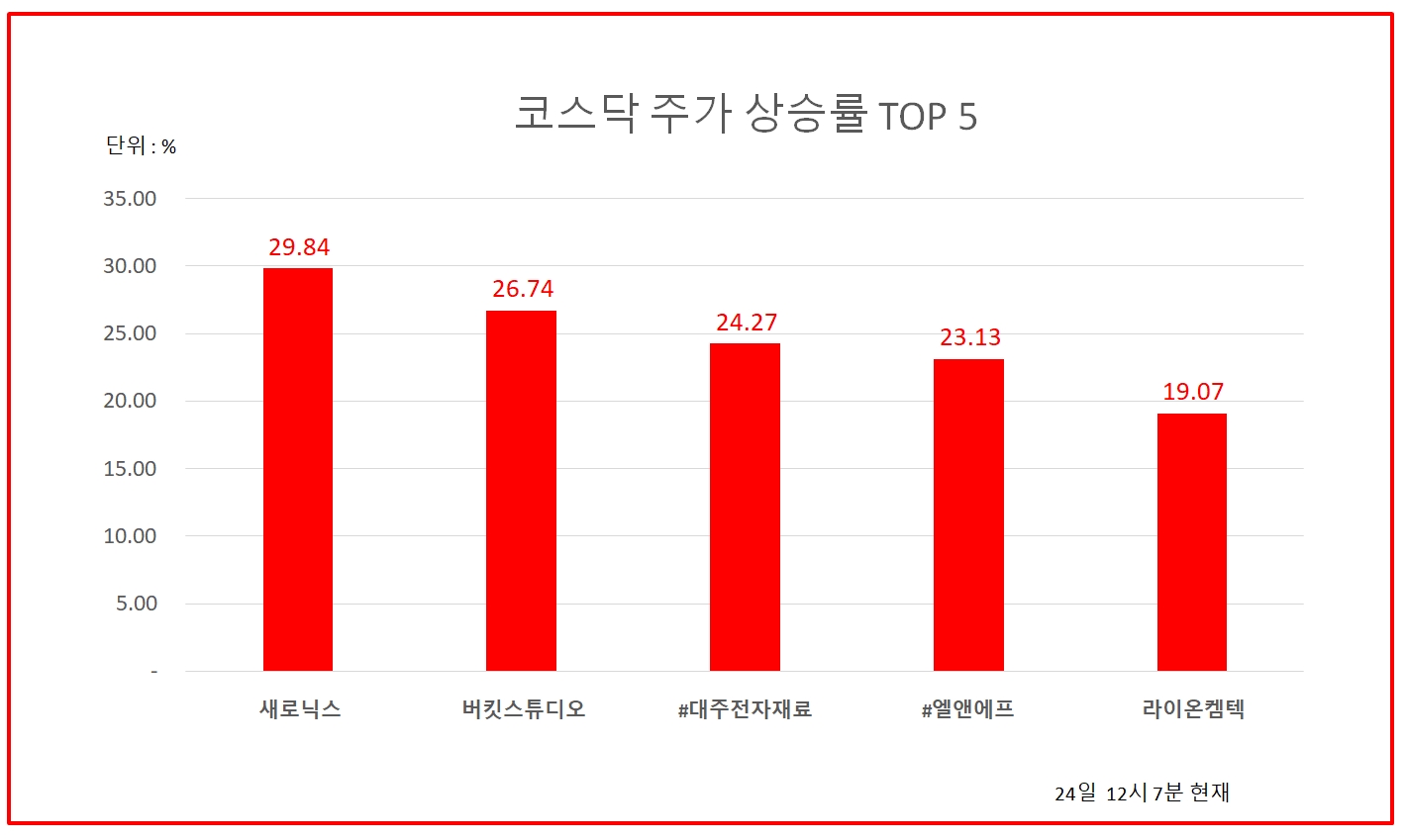 24일 오후 12시 7분 현재 코스닥 상승률 상위 50개 종목은 다음과 같다.