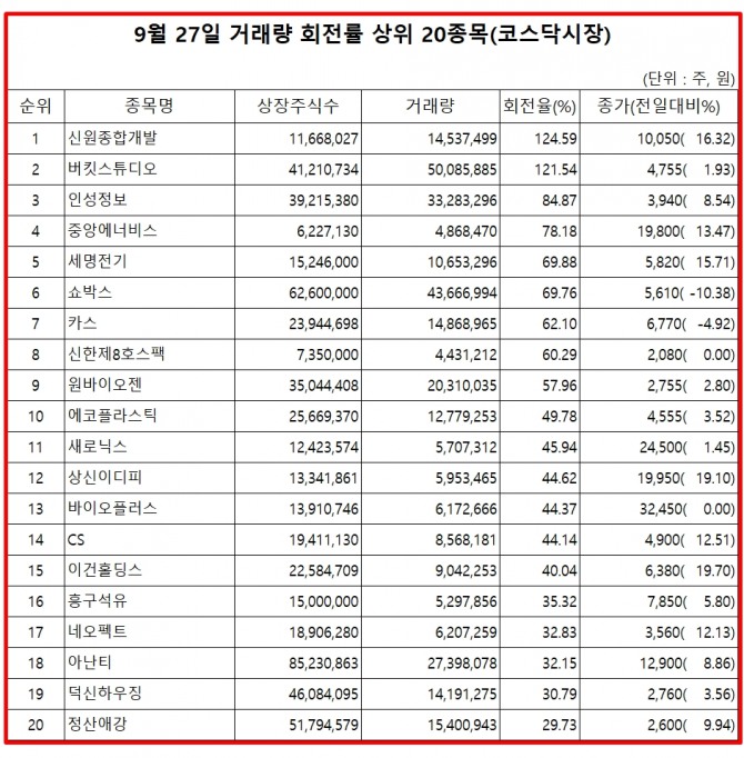 27일 주식시장에서 코스닥 종목의 거래량 회전율 기준 상위 종목은 다음과 같다.