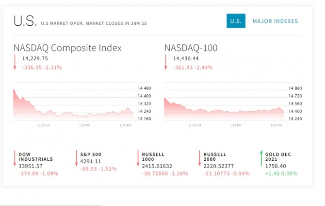 이미지 확대보기5일 뉴욕증시에 따르면 뉴욕증권거래소(NYSE)에서 다우존스30산업평균지수와 스탠더드앤드푸어스(S&P)500지수 그리고 기술주의 나스닥지수 모두 떨어지고 있다. 그중에서 특히 나스닥 지수의 하락 폭이 크다. 뉴욕증시에서는 미국의 국채 금리, 중국 헝다 사태 그리고 부채한도 협상에 따른 국가부도 상황등이 이슈이다.