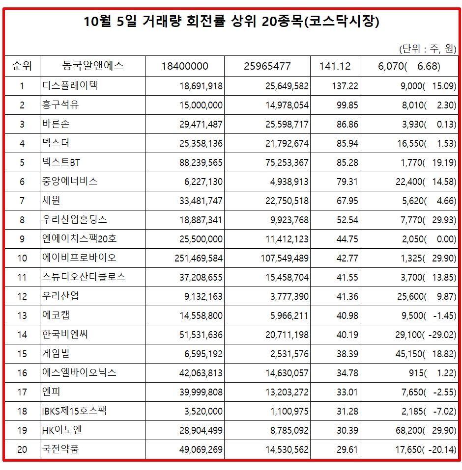 5일 주식시장에서 코스닥 종목의 거래량 회전율 기준 상위 종목은 다음과 같다.