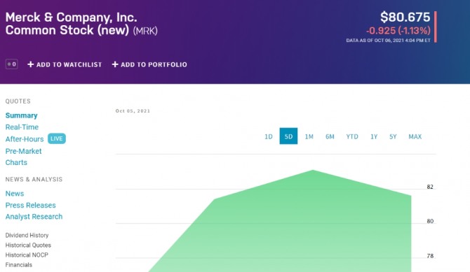 이미지 확대보기7일 뉴욕증시에 따르면 머크(MSD) 주가는 코로나 치료제 식약처 승인 신청이후 폭발했으니 부작용 여부에 관심이 쏠리면서 하락 반전했다. 머크 코로나 치료제 '물누피라비르'의 부작용 사례는 12%로 나타났다. 또 임상 진행중 부작용으로 인한 복용 중단 사례도 1.3%로 집계됐다. 머크의 치료제 부작용으로 모더나와 화이자 백신의 중요선은 더 커졌다. 이 추세는 sk바이오노닉스 삼성 바이오등 제약 바이오주에도 영향을 줄 것으로 보인다.