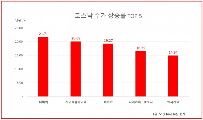 뒤를 이어 지더블유바이텍과 바른손도 각각 20.09%와 19.27% 오르며 상승률 상위권에 포진했다.