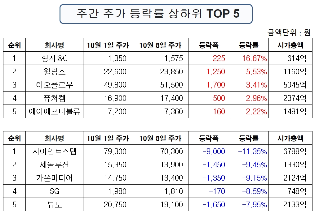 표기순서는 순위, 종목명, 주가, 주간 등락폭, 주간 등락률 순이다.