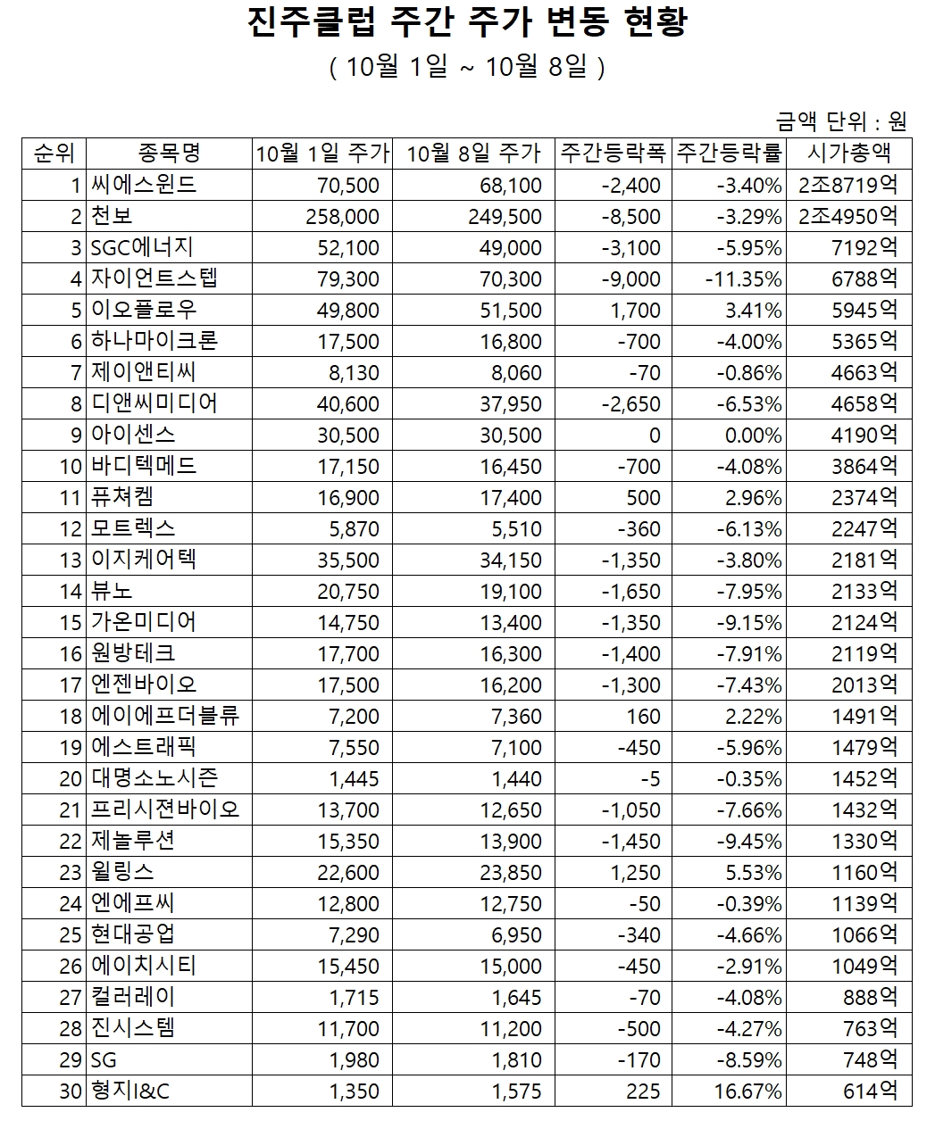 '진주클럽' 전체 시가총액은 지난 1일 기준 13조1191억 원에서 한주간 5056억 원(3.9%) 감소해 8일 현재 12조6135억 원을 기록했다.